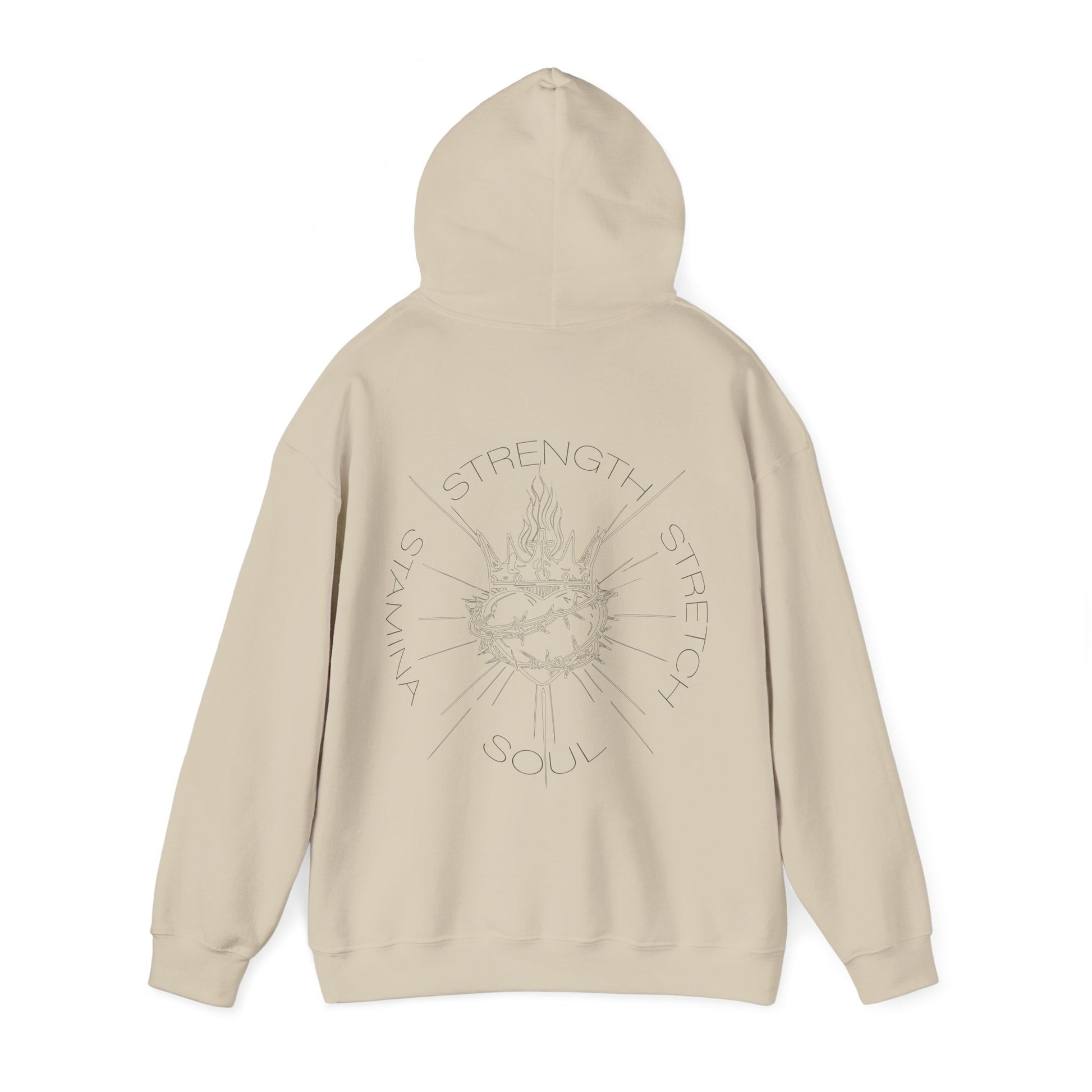 This warm, mid-weight hooded sweatshirt blends quiet style with wearable comfort. Soft, slightly oversized fit and a double-lined hood give it a calm, cocooning presence. Subtle, tone-on-tone artwork on the chest and a larger, finely detailed design across the back add an understated, reflective mood — like a wearable journal entry. The kangaroo pocket and color-matched drawcord keep the look cohesive, while durable 50/50 cotton–poly fabric holds shape and print through repeated wear. It settles into slow Sunday mornings, post-service conversations, and evenings with friends when you want something simple, sincere, and comfortably familiar.