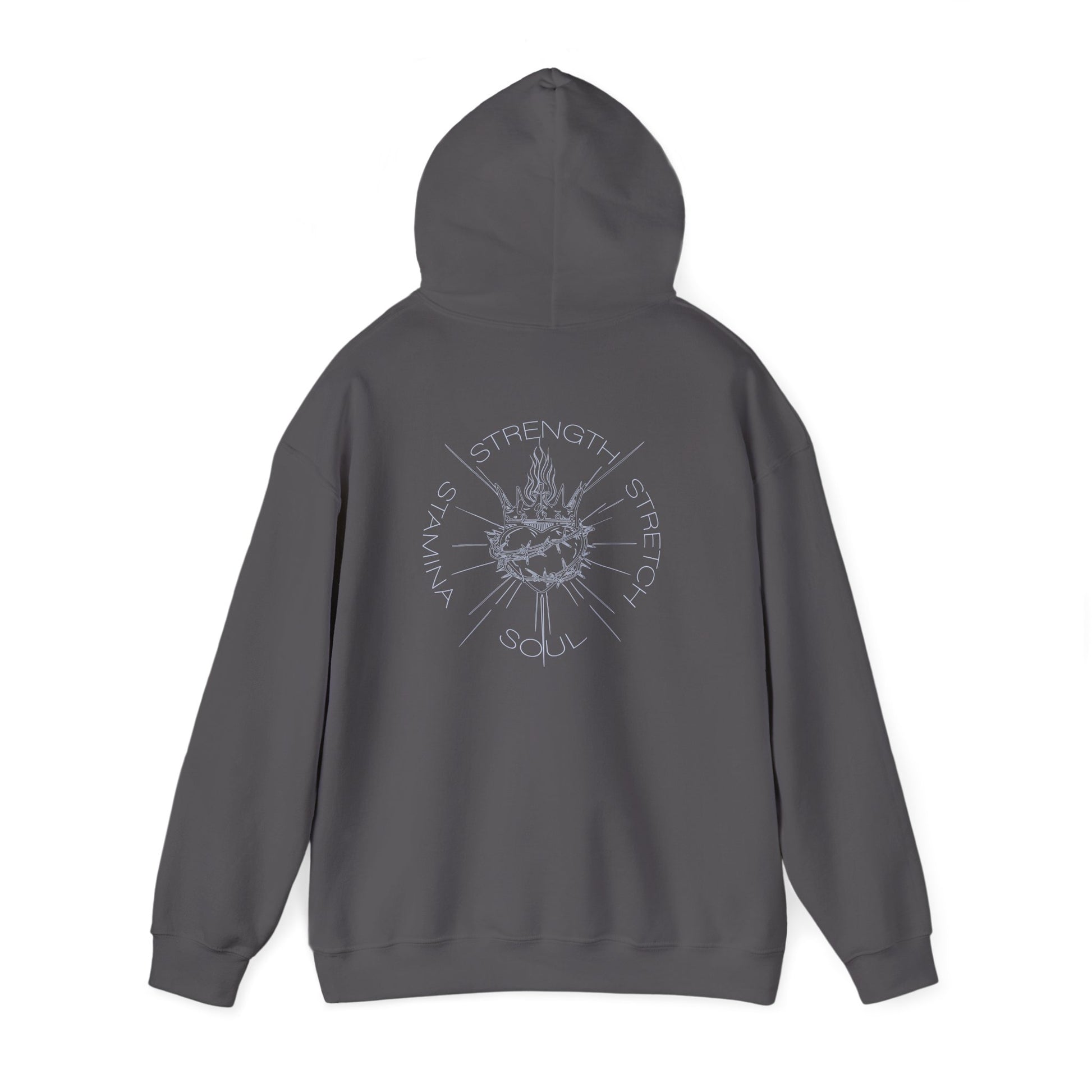 This charcoal hoodie carries a quiet, contemplative energy — soft fabric, muted lettering on the chest, and a subtle, symbolic graphic across the back. Wear it in class (get cozy for meditation), on slow mornings or evenings when you want to move through the world a little more comfortably. It layers easily over tees and flannels, and the roomy pouch pocket and double-lined hood invite hands and shoulders to relax. For those who collect calm moments and meaningful rituals, this is clothing that settles into daily life rather than shouting for attention.